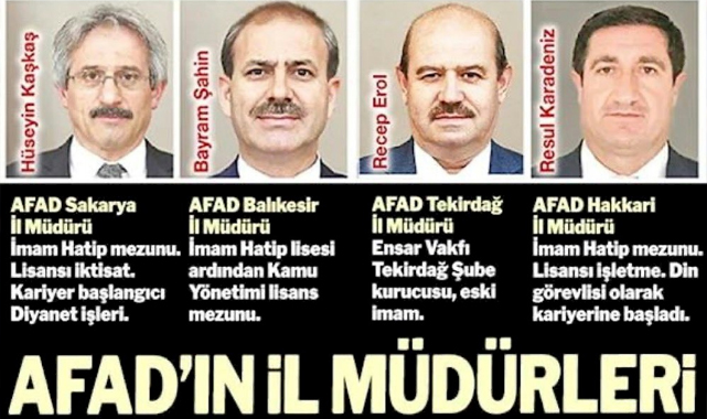 Öte yandan AFAD il müdürleri arasında çok sayıda imam var. AFAD Ağrı İl Müdürü Necati Oruk imam hatip lisesinin ardından işletme okudu. AFAD Balıkesir İl Müdürü Bayram Şahin, imam hatip lisesi mezunu, üniversite eğitimini kamu yönetimi dalında aldı. AFAD Sakarya İl Müdürü Hüseyin Kaşkaş, imam hatip lisesi mezunu. Üniversitede iktisat okudu. Kaşkaş eski AKP Ferizli Belediye Başkanı olduğu biliniyor. Kaşkaş'ın oğlu Enes Kaşkaş’ın da AKP Gençlik Kolları Sosyal Politikalar Başkanı olduğu öğrenildi.