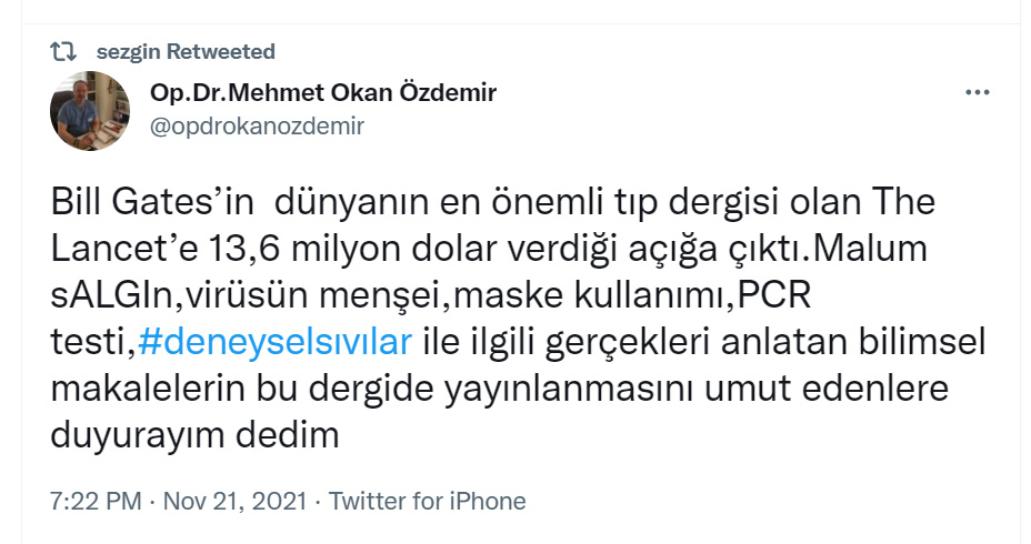 '' Bill Gates’in dünyanın en önemli tıp dergisi olan The Lancet’e 13,6 milyon dolar verdiği açığa çıktı. Malum sALGIn, virüsün menşei, maske kullanımı, PCR testi,#deneyselsıvılar ile ilgili gerçekleri anlatan bilimsel makalelerin bu dergide yayınlanmasını umut edenlere duyurayım dedim.